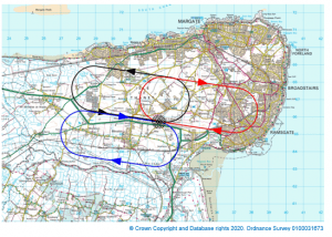 To facilitate access to the airport for General Aviation (GA) users, a Non-Directional Beacon (NDB) Hold will be established in the airfield overhead for the use of GA aircraft for both training and whilst awaiting approval to land at the airport. The NDB Hold will only be used by Cat A or Cat B aircraft at a maximum speed of 140 Knots corrected Indicated Air Speed (KIAS). The Hold will be based on the position of the NDB and will consist of a 1-minute racetrack, orientated in alignment with the runway. Figure 4 below shows the 4 possible options for the position of the Hold. The minimum height for aircraft in the Hold would be 2,000 ft. The actual position that the NDB will be located at is still to be determined as part of the airport redevelopment so the tracks of the Hold may vary slightly to those shown below.